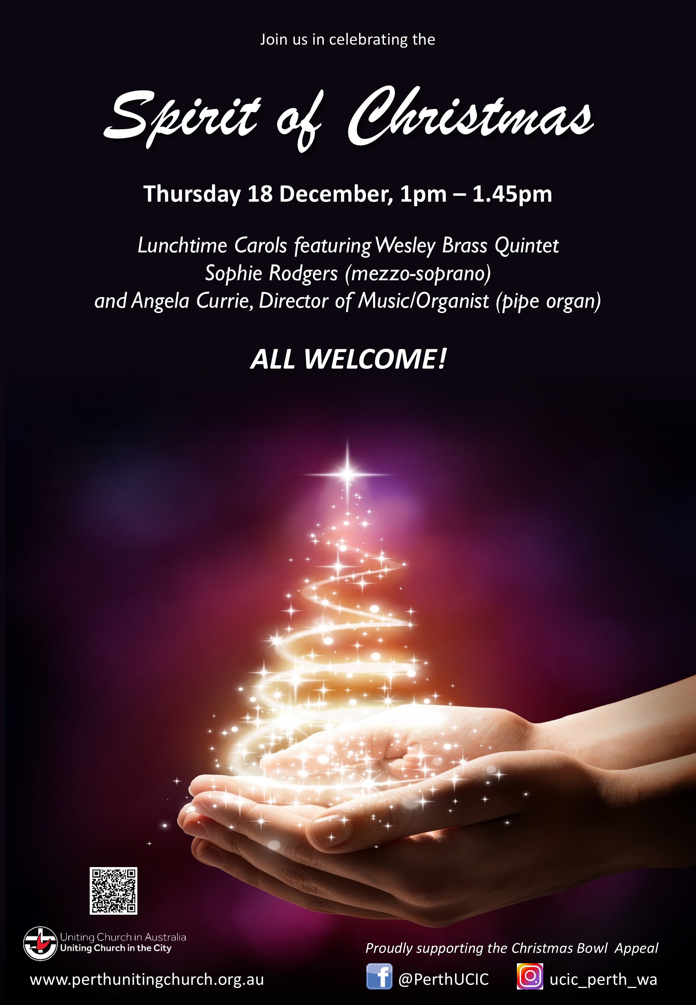 Date: Dec, Thursday 18th 1:00 PM - Dec, Thursday 18th 1:45 PMJoin us from 1pm on Thursday 18 December for our Lunchtime Carols at Wesley Church, on the corner of William & Hay Streets, Perth, featuring beautiful music from the Wesley Brass Quintet, Sophie Rodgers (mezzo-soprano) and Angela Currie, Director of Music/Organist (pipe organ).